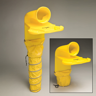Allegro's Manhole Ventilation Passthru (MVP) is the first manhole system that combines the low profile manhole air vent, 90° elbow and built in mounting all into one easy assembly. This unit comes with a collapsible duct, for easy entry, stored in a small storage bag that can be dropped down into the manhole with a quick release of the drawstring. The Collapsible duct springs back into shape once worker is down into the manhole. The ducting is vinyl and polyester with PVC coating and heat resistant up to 180° F. The manhole cover fits into a flat channel corner for stabilization. Compact, lightweight and made from Linear Low Density Polyethylene (LLDPE), this unit is easy to store and ships in one small carton. Recyclable.