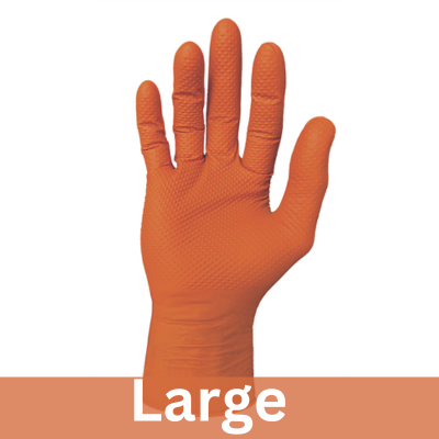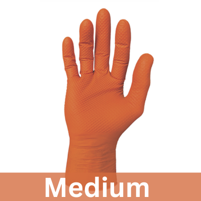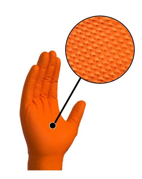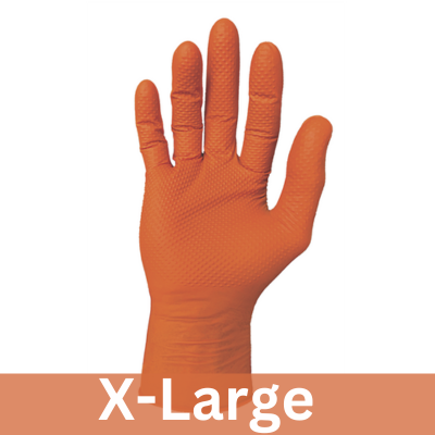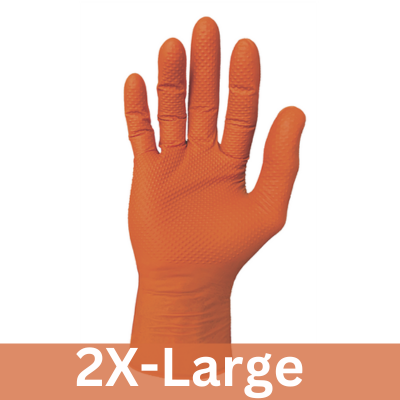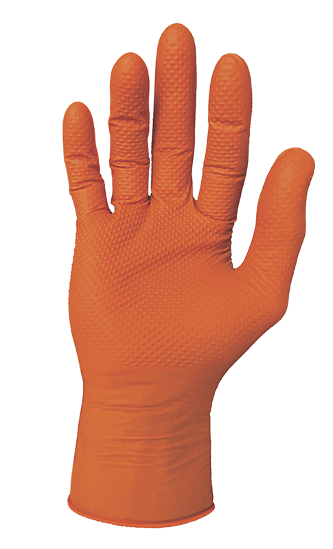 Made from ultra-durable 9 mil thick nitrile, these gloves are engineered for tough jobs and superior performance. The raised diamond texture provides a strong, slip-resistant grip—even in wet or oily conditions—while the bright orange color boosts visibility and safety. Perfect for professionals across industries including automotive, food handling, manufacturing, construction, janitorial services, and general safety.