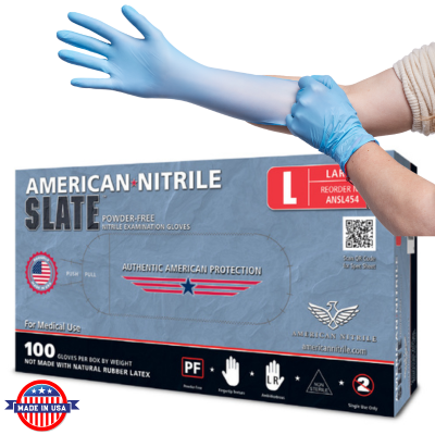 The American Nitrile Slate Nitrile gloves feature Compression Fit Technology for enhanced strength and a greater tactile sensitivity.  American Nitrile Gloves are proudly manufactured in their Grove City, Ohio facility and are 100% Made in the USA.