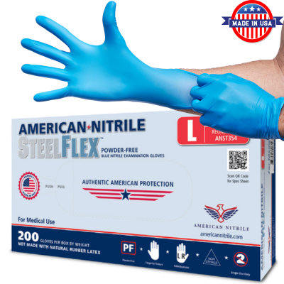 The American Nitrile Steel Flex Nitrile gloves feature an uncompromising medical grade quality with a barrier to protect patients and practitioners.  American Nitrile Gloves are proudly manufactured in their Grove City, Ohio facility and are 100% Made in the USA.