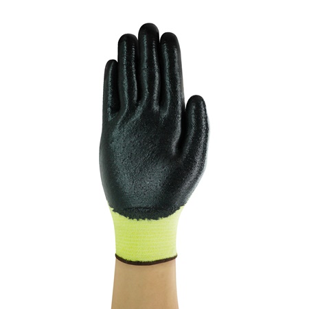 These HyFlex gloves are made from patented Nylon and Kevlar zonal nylon plaiting on the palm and back. The black foam nitrile coated palm provides enhanced grip in light oil conditions while increasing abrasion resistance. The padded integral cuff gives a soft feel, while providing cut protection on the outside. The patented nitrile foam technology allows for longer wear in thumb crevice and palm surface. Patented Knitted Variable Stitch Design (KVSD) gives improved fit by releasing tension in high stress zones of the glove. Great for sheet metal handling, glass installation, pipefitting, wiring, carpentry or HVAC applications and more.