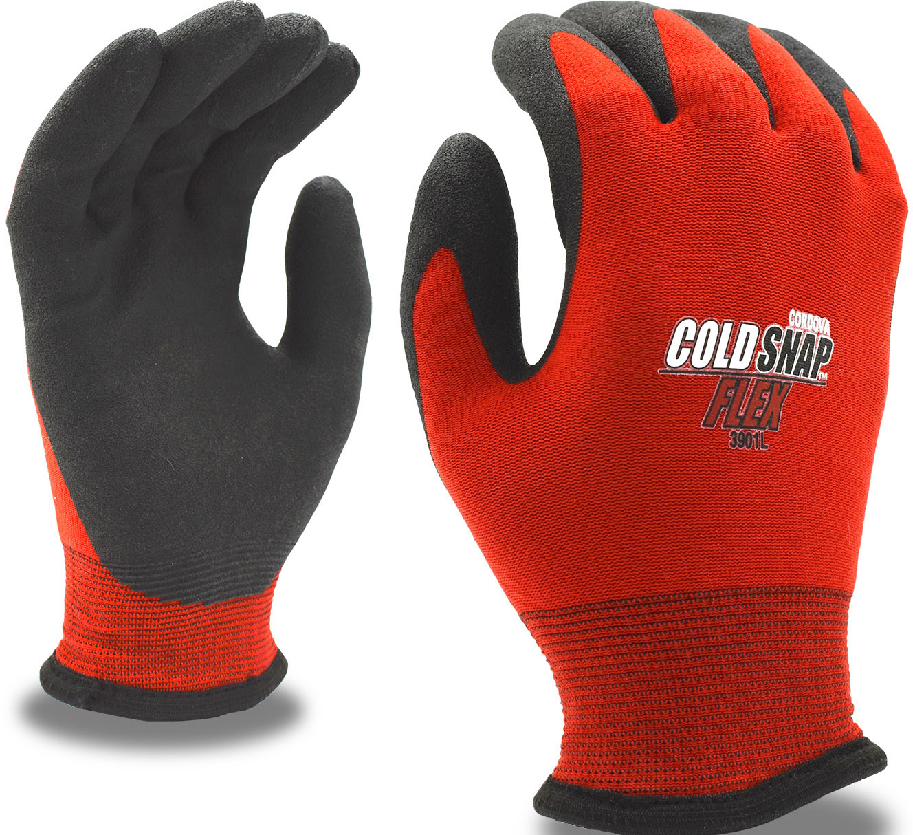 Foam PVC remains flexible in temperatures as low as -32°F, making the Cold Snap Flex™ glove ideal for cold-weather applications. The CORDOVA SAFETY PRODUCTS brand Cold Snap Flex™ provides a thermal, 2-ply, 15-gauge, red, nylon outer shell and brushed-acrylic inner lining. It features a black, foam, PVC, palm coating for added gripping power and an A3 cut level.