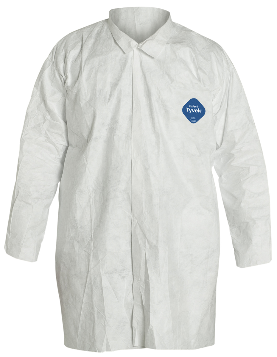 Dupont TY210S Disposable Tyvek Frock, Open Wrists, Snap Front, No Pockets, Hip Length, White - 30/Case