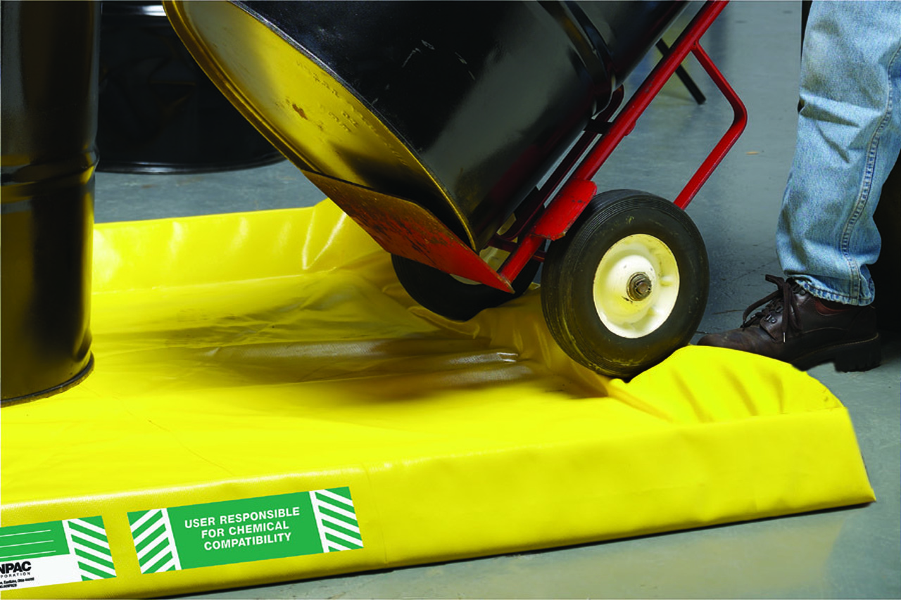 SpillPal is a low profile flexible containment alternative for drip and leak protection. The enclosed foam sidewalls make it easy to load and unload with a hand truck, while the tough industrial fabric can stand up to some of the harshest chemicals. As an added benefit, it can fold up and out of the way when not in use, saving valuable floor space. The optional grate raises containers above the sump for less mess in case of a spill.