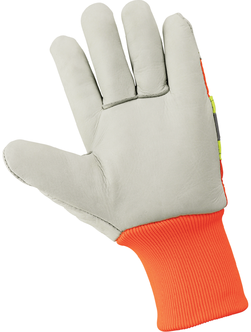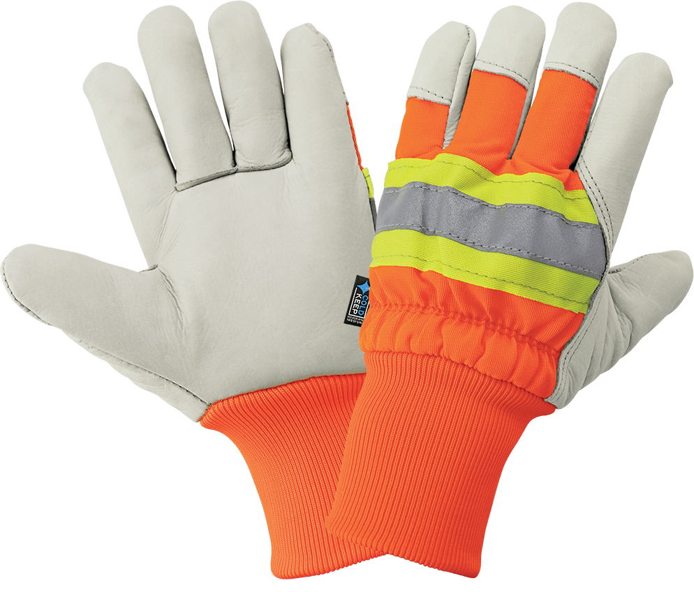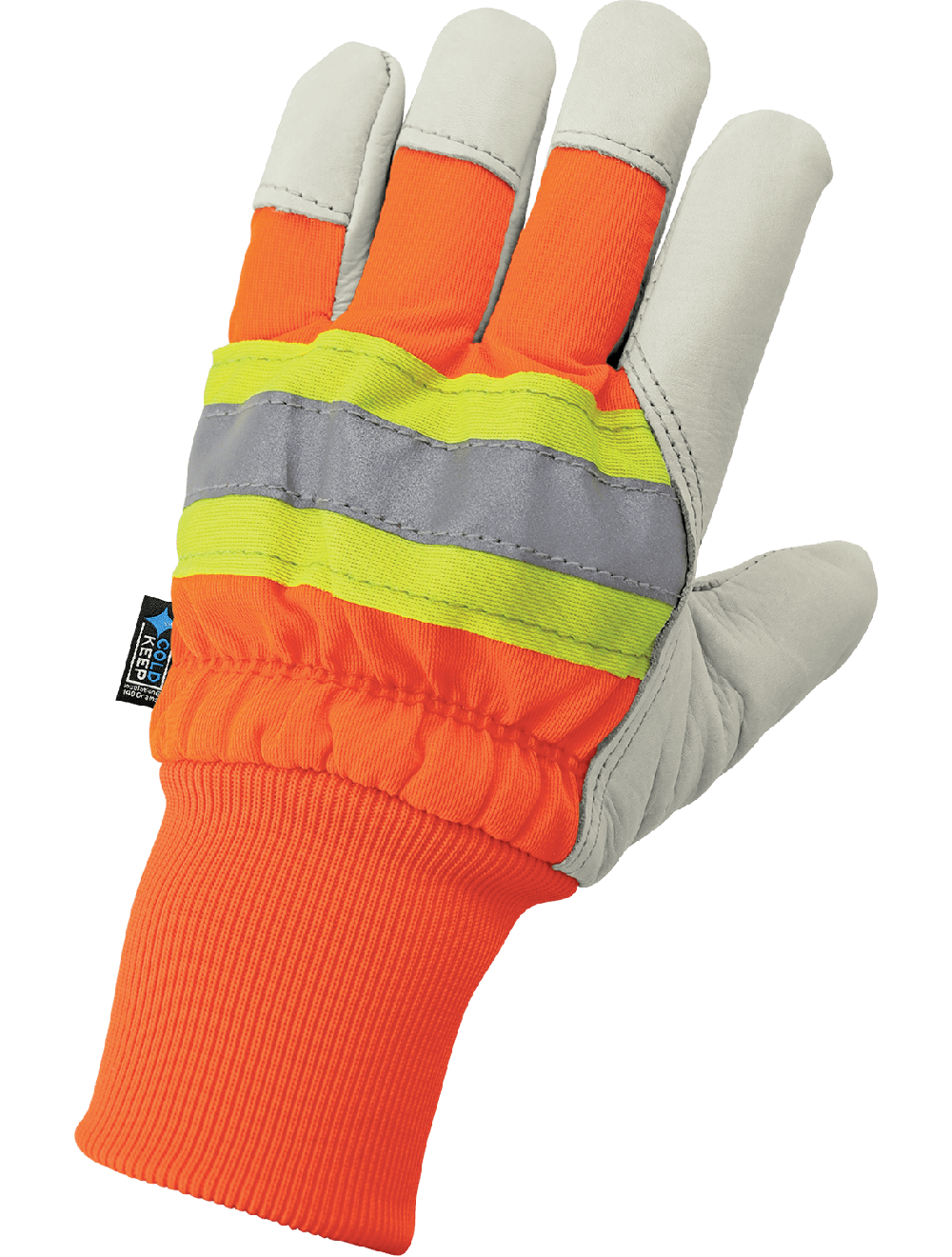 These gunn cut standard-grade grain cowhide cold weather gloves from Global Glove are lined with 140 grams of Cold Keep® insulation and feature 3M™ Scotchlite™ reflective tape on high-visibility orange nylon backing with a knit wrist.
