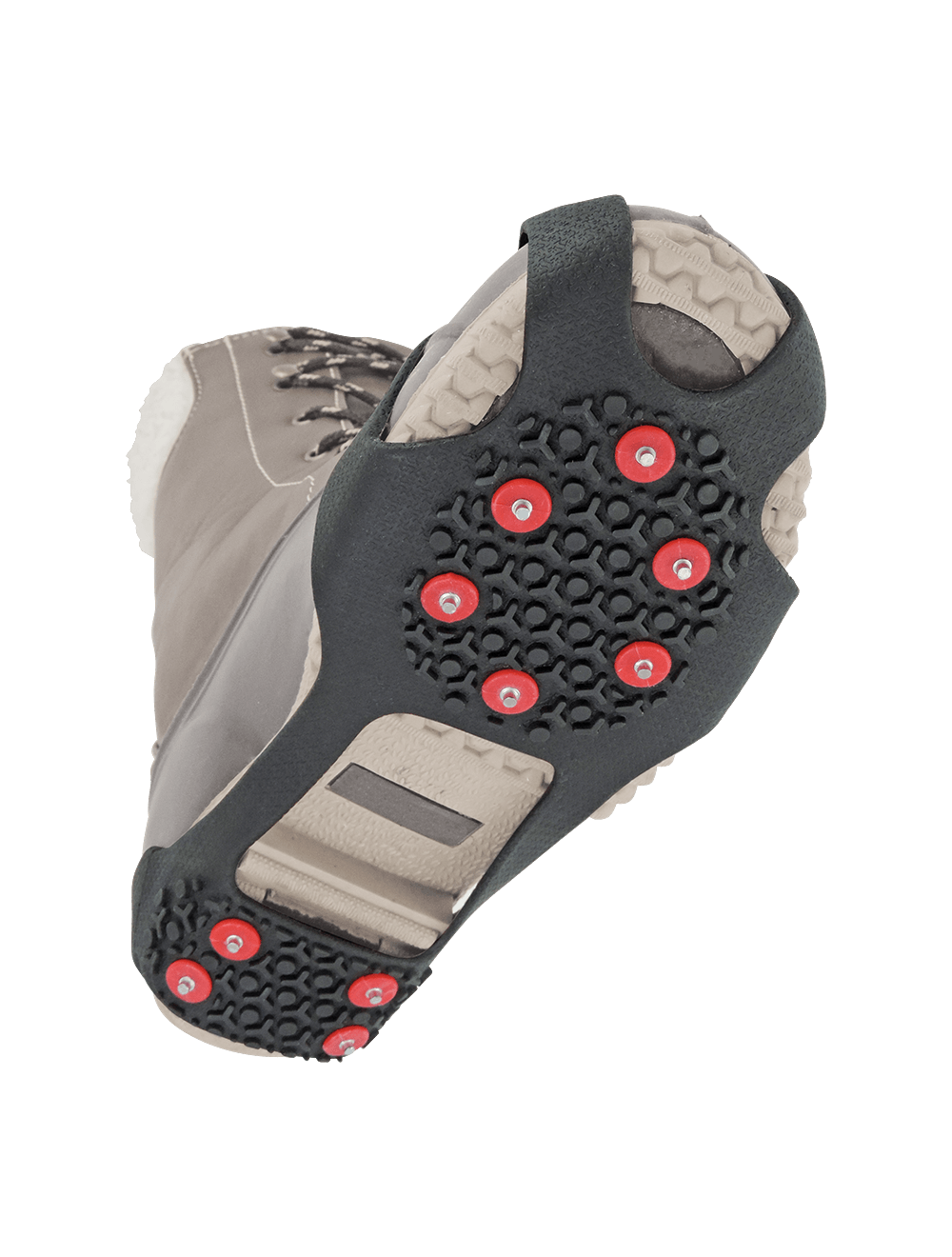 Anti-slip ice traction cleats, 10 carbon steel studs, flexible TPE material, pull tab.