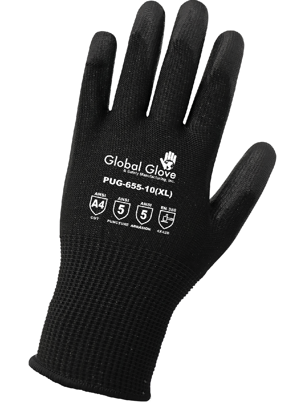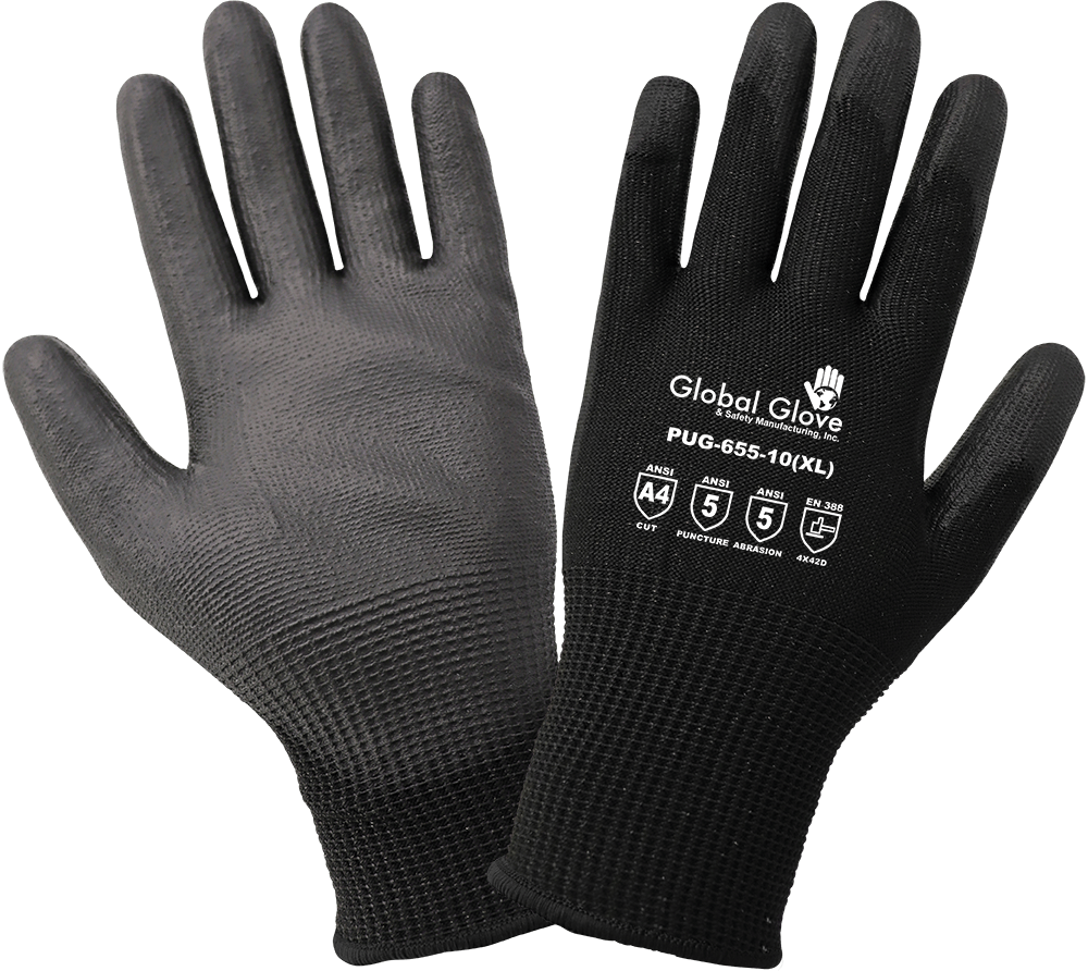 Global GloveŽ PUG-655 Smooth Polyurethane Coated Black HPPE Cut and Puncture Resistant Gloves, Cut Level A4, Dozen