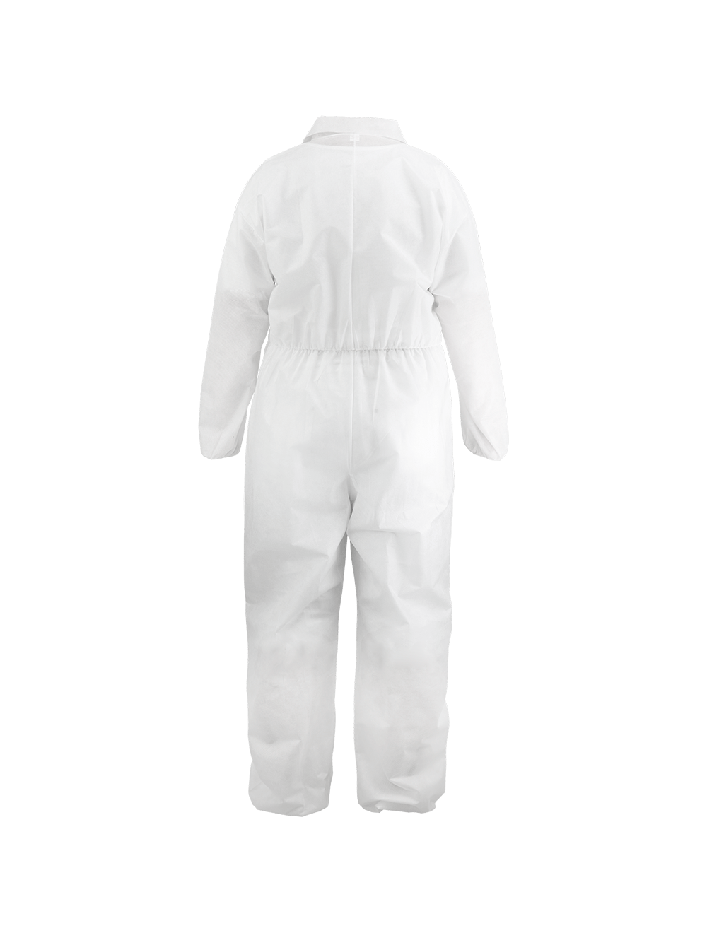 These disposable, non-woven coveralls are a great option for workers needing a durable coverall with light splash protection. The white 50-gram SMS material, reinforced triangle crotch, and serged seams provide the user with more protection. Includes elastic ankles, waist, and wrists, and zipper closure with storm flap. Meets Type 5 & 6 protection. FDA compliant materials.