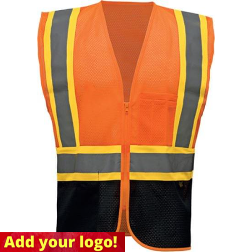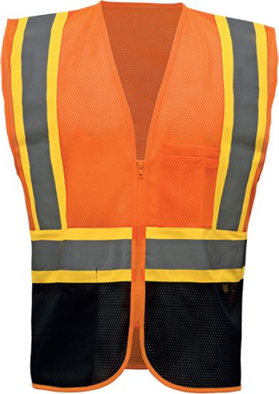 GSSŪ 1106 Class 2 Mesh Two-Tone Hi-Vis Orange Safety Vest, Black Bottom, 2 Pockets, Zipper Close