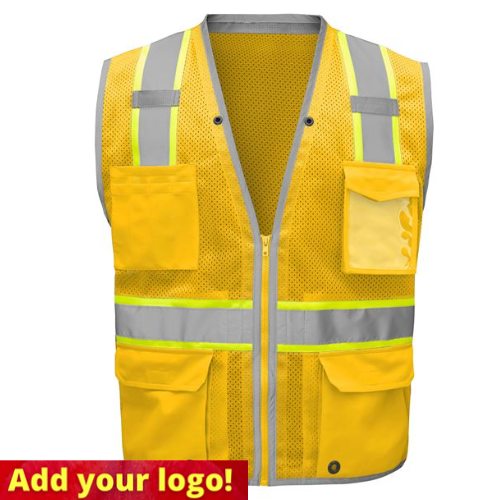 This economic enhanced visibility hi-vis vest from GSS features 2” reflective tape set on bright reflective edging to give the user extra visibility.  This safety vest features 6 pockets, including 2 inside pockets and a zipper front closure.  Made from 100% Smooth Mesh Polyester, this vest is ideal for employee Identification, special events and off road situations where visibility is a must.
