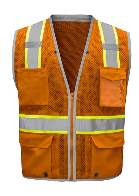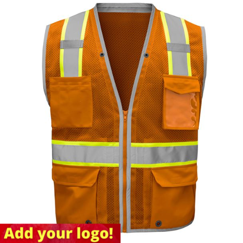 This economic enhanced visibility hi-vis vest from GSS features 2” reflective tape set on bright reflective edging to give the user extra visibility.  This safety vest features 6 pockets, including 2 inside pockets and a zipper front closure.  Made from 100% Smooth Mesh Polyester, this vest is ideal for employee Identification, special events and off road situations where visibility is a must.