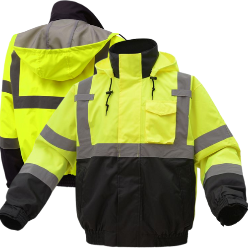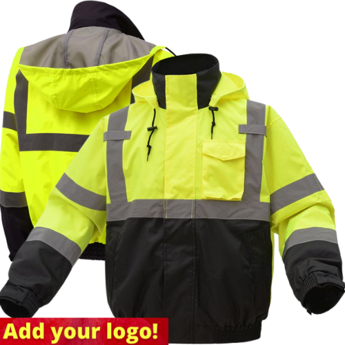 This high-vis lime bomber jacket features black material in areas that get the most soiled.  Features a Polyurethane coated oxford material with a black ripstop bottom.  Also includes a removable fleece sweatshirt with reflective tape on the sleeves.  Includes 4 pockets and a zipper front with a storm flap. Add your company logo or department to this jacket. Call us a 1-800-511-8652 for more information.