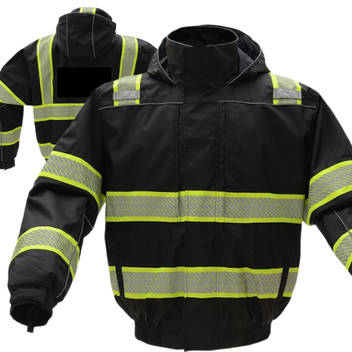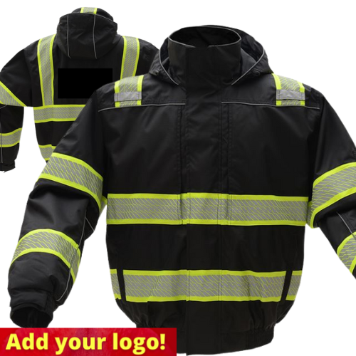 This black Class 2 bomber jacket features black material in areas that get the most soiled.  Features sealed seams for warmth and waterproofing.  Includes a zipper closure with storm flap and removable hood.  Repels water, oil and stains.  Includes a fleece liner for warmth. Add your company logo or department to this jacket. Call us a 1-800-511-8652 for more information.