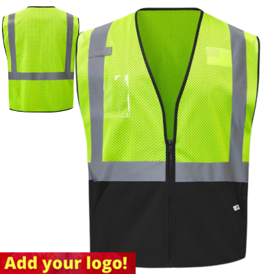 GSS Eco Repreve recycled polyester Class 2 vests feature 2” reflective tape, plastic ID pocket on the right chest, 2 lower outside pockets and a zipper closure.  Vests feature Hi-Vis Lime upper with color lower with corresponding piping.  Easily add your logo and customization to these vests!  Call customer care for more information and a detailed quote.