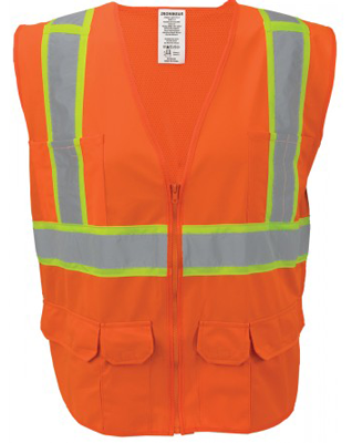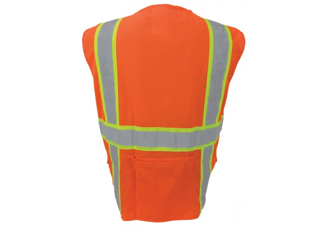 • Color – Orange with 2” Silver and 4” Lime Reflective Striping in a Suspender Pattern Over Top of Shoulders as Well as 360˚ Continuous Reflective Band Encircling the Torso