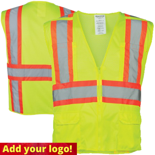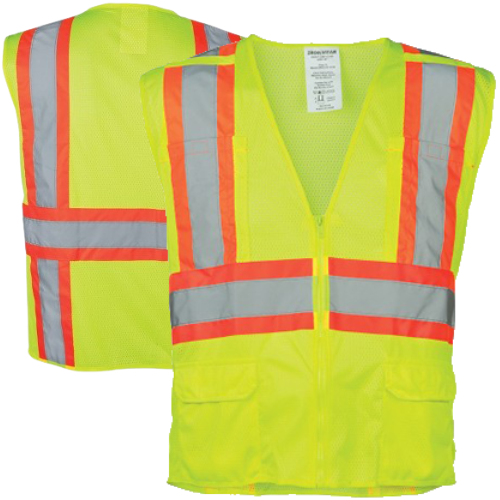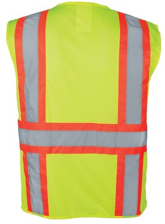 • Color – Lime with 2” Silver and 4” Orange Reflective Striping in a Suspender Pattern Over Top of Shoulders and a 360˚ Continuous Reflective Band Encircling the Torso