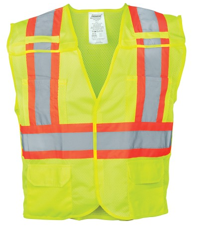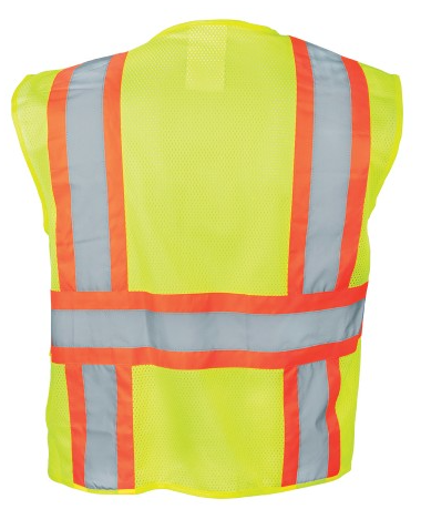 • Color – Lime with 2" Silver Reflective Striping and 4" Orange Contrast Striping in a Suspender Pattern Over Top of Shoulders as Well as 360˚ Continuous Bands Encircling the Torso