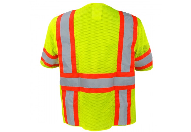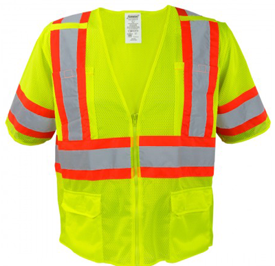 • Color – Lime with 2” Silver and 4” Orange Reflective Striping in a Suspender Pattern Over Top of Shoulders as Well as 360˚ Continuous Reflective Band Encircling the Torso