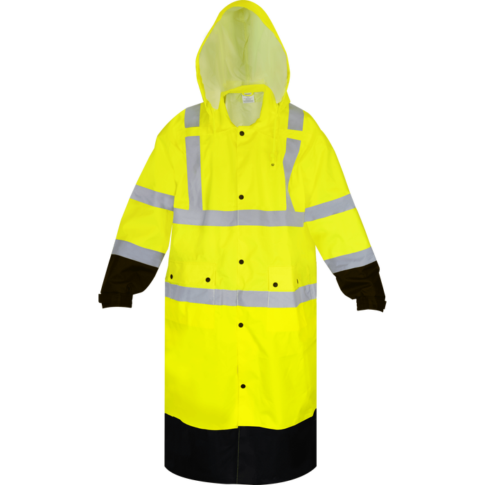 This Ironwear Waterproof Rain Coat features 2 pockets, 2 mic tabs (radio holders) and a badge tab.  The Class 3 raincoat has 2” silver reflective tape and black bottom and cuffs to help hide dirt and grime.