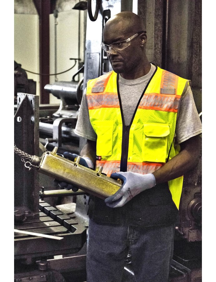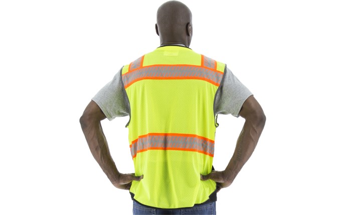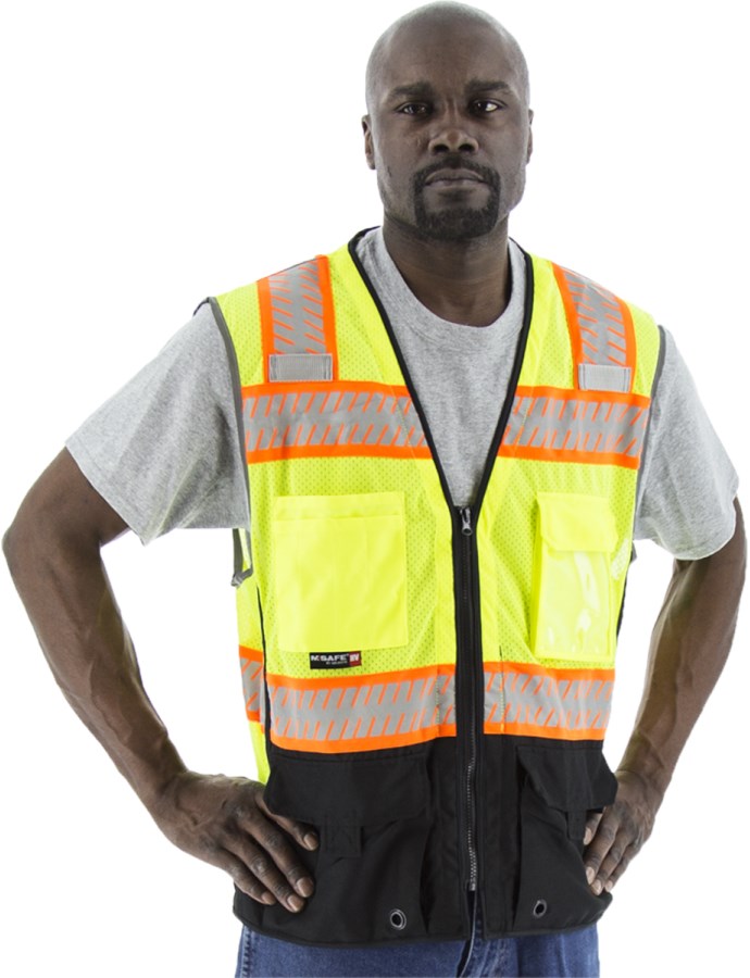 • Durable mesh safety vest featuring black sections in high-wear zones to conceal stains and enhance appearance