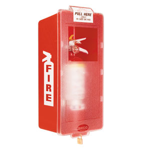 These Mark Series Fire Extinguisher Cabinets are great in storing fire extinguishers safely and handily. These are made from injection-molded high impact ABS plastic that won't dent, rust or corrode. Plus, their unique design eliminates a breaker bar and broken glass! Comes with brass lock, cover and screen printed pictogram. The cabinets nest together reducing shipping costs and storage space! Both Indoor & Indoor/Outdoor style available with different color combinations. The Mark I Jr. Measure 19 1/2"H x 8 3/4"W x 5 5/8"D. The maximum height of a fire extinguisher to be stored in this cabinet is 16 1/2".