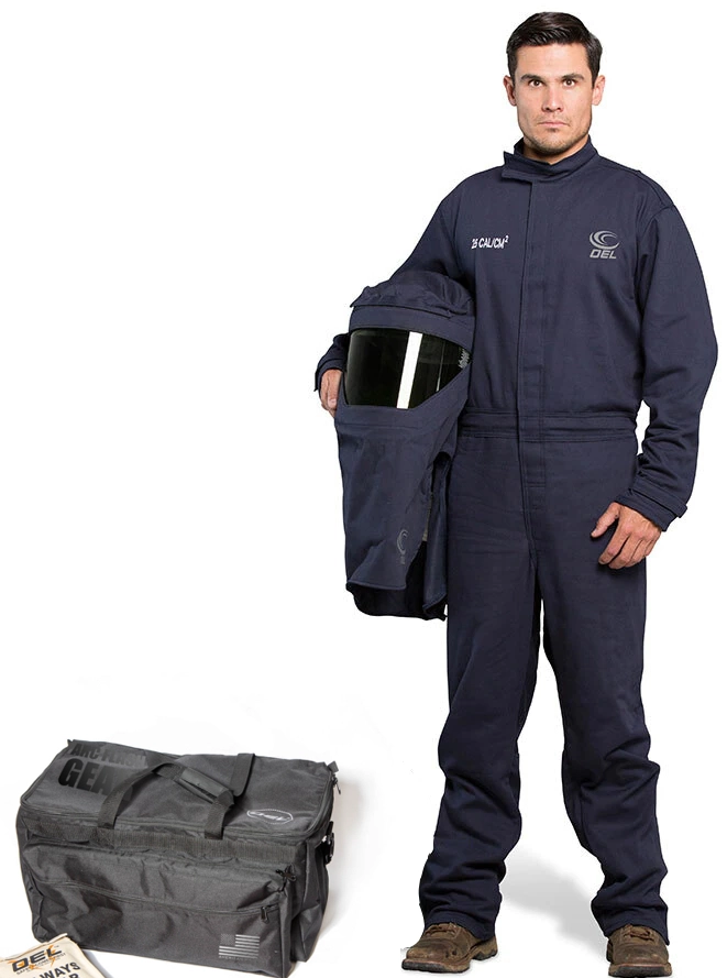 OELŪ 25 Cal/cm2 CAT 3 Coverall Arc Flash Protection Kit with Switchgear Hood with Dual Fans and Light, NFPA 70E, Navy