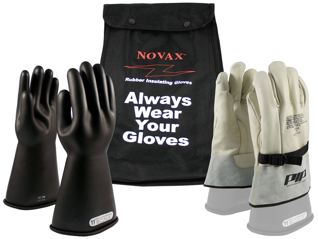 PIP® Novax® 150-SK-1 Class 1 Rubber Insulated Electrical Gloves Kit, Black Gloves with Goatskin Protectors and Bag