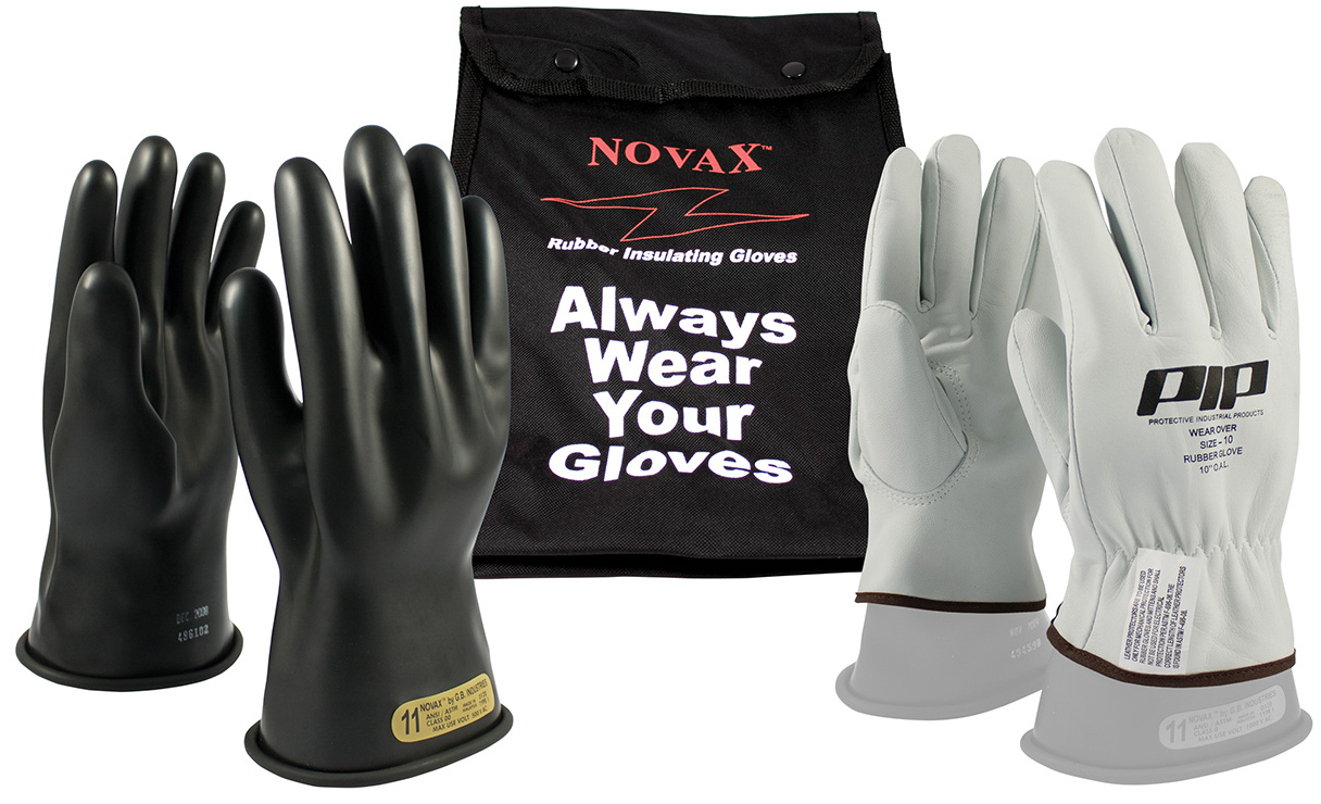 PIP® Novax® Class 00 Rubber Insulated 11" Electrical Gloves Kit, Black Gloves with Goatskin Protectors and Bag
