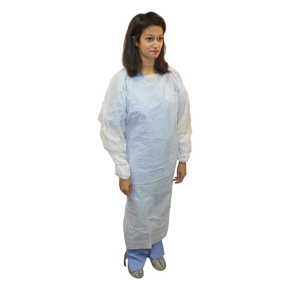These isolation gowns are made of a high quality, virgin polyethylene material that combines flexibility and resistance to chemical, food and light contamination. Component materials comply with FDA regulations for food contact.