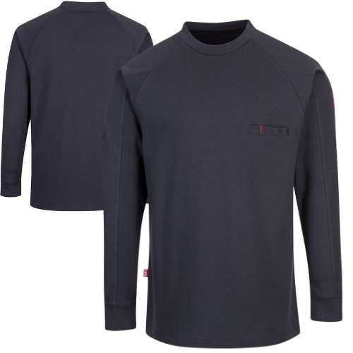 The Portwest Bizflame FR Crew Neck shirt includes moisture wicking properties in the fabric to keep warm, yet cool and dry.  Made from a high performamce interlock knit material with raglan sleeves for a comfortable fit. The Portwest long sleeved fr shirt has a flame resistant ribbed cuff for additional safety.