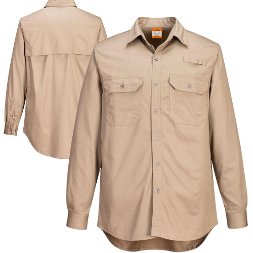 Portwest® FR705KHR Portflame Plus Vented Khaki FR Button Down Shirt, 8.7 cal/cm2, Dual Hazard Protection