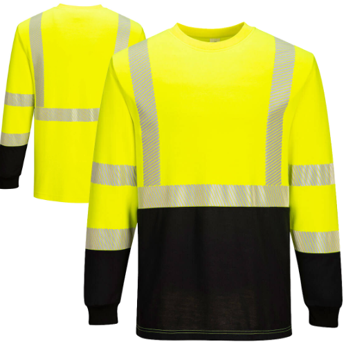 The hi-vis Portwest FR crew neck t-shirt provides maximum comfort.  The shirt is made from a comfortable interlock knit fabric offering high insulation while still being lightweight.  FR Shirt has contrast panels for dirt coverage and heat applied segmented reflective tape.  Meets NFPA 70E standards and ATPV 9 cal/cm2.