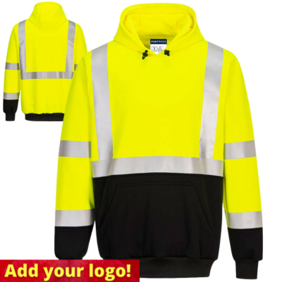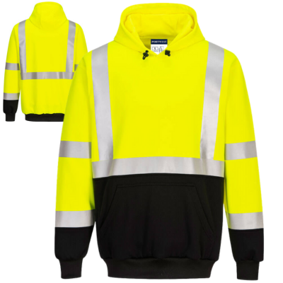 The Portwest UB324 Class 2/3 Two-Tone Hooded Sweatshirt offers an enhanced user visibility with reflective tape around chest, over shoulders and arms.  This pullover style sweatshirt features a black bottom to cover dirt and grime.