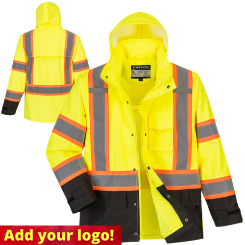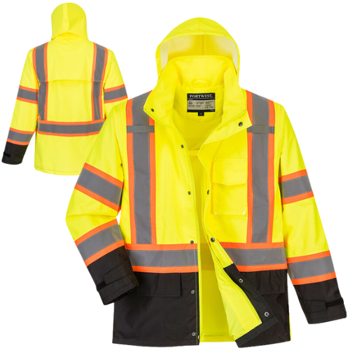 Portwest® US361 Hi-Vis Yellow/Black Two-Tone Contrast Tape Raincoat, Class 3, Pack Away Hood