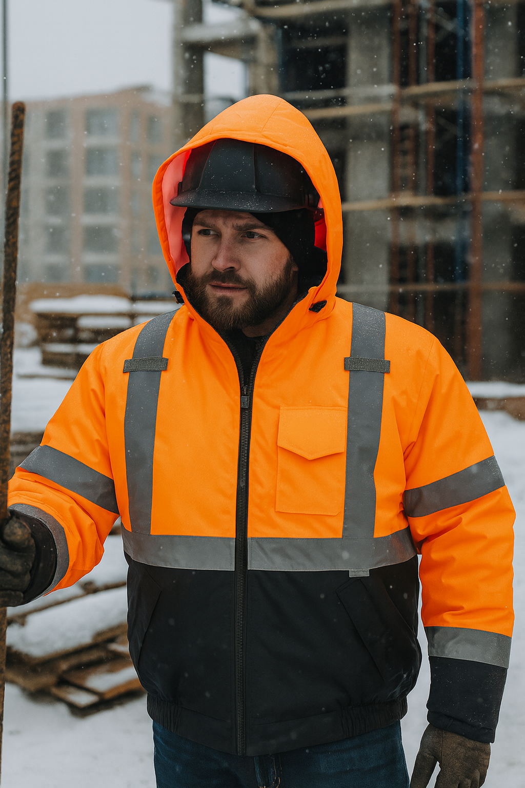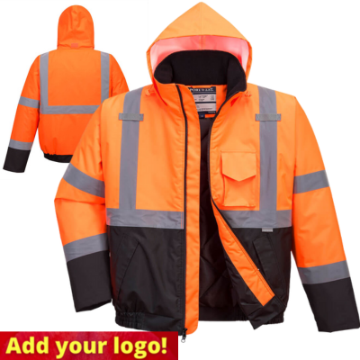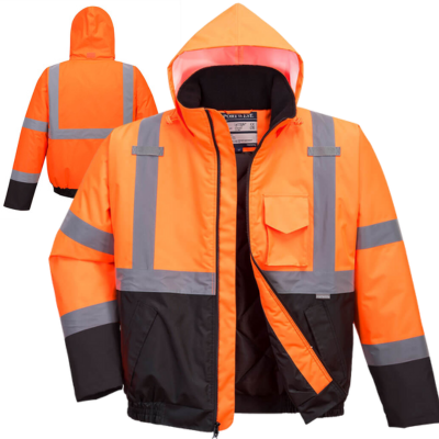 This Portwest high-vis orange bomber jacket features black material in areas that get the most soiled.  Features a polyester material with a black bottom.  Includes 4 pockets and pack away adjustable hood.