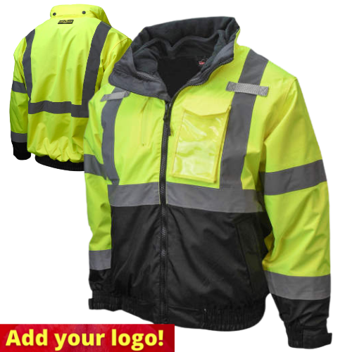 Radians SJ210B 3-in-1 Deluxe Bomber Jacket with black bottom has a zip out fleece jacket, concealed attached hood, elasticized waistband and several inner and outer pockets. Safety jacket has 2" silver reflective tape for high visibility.