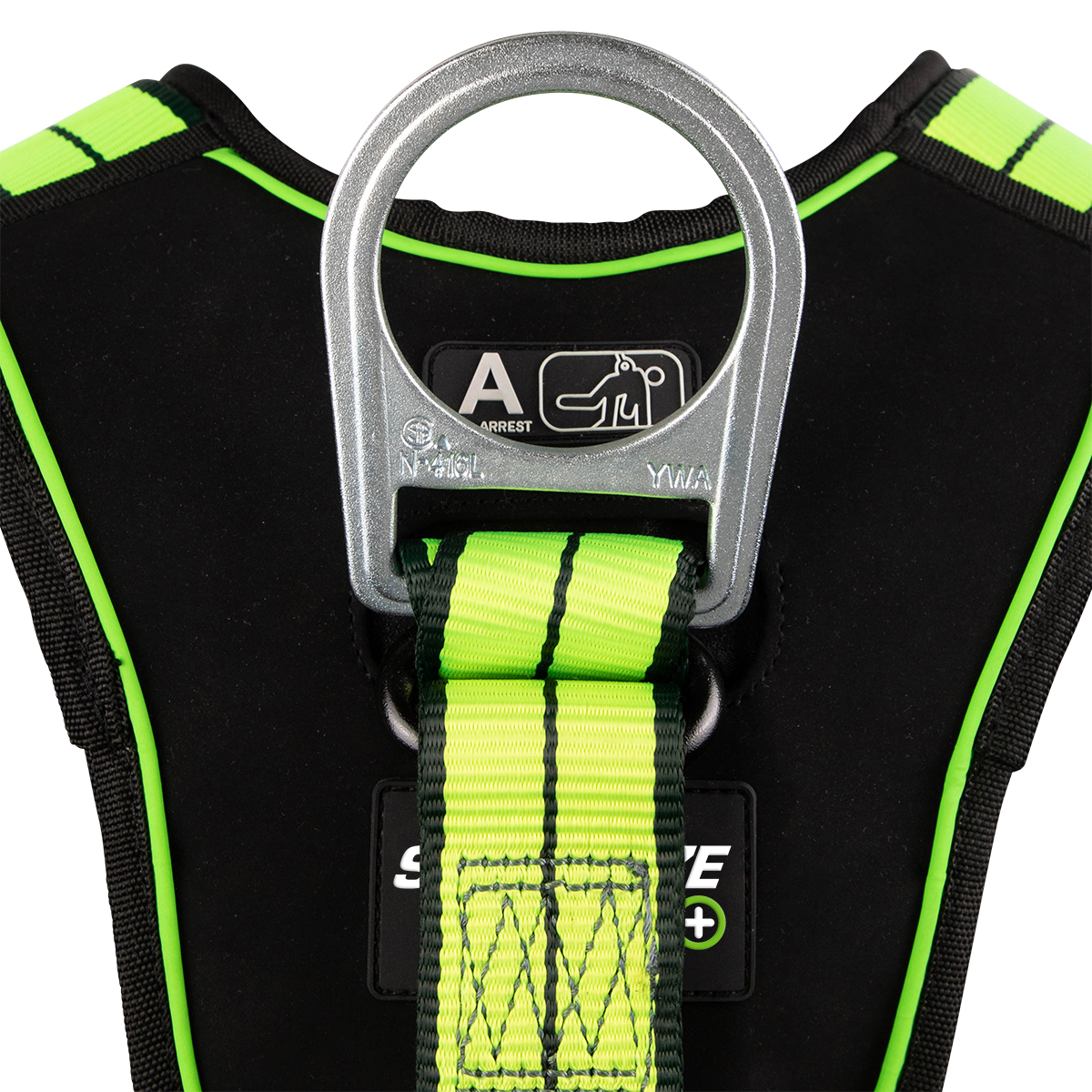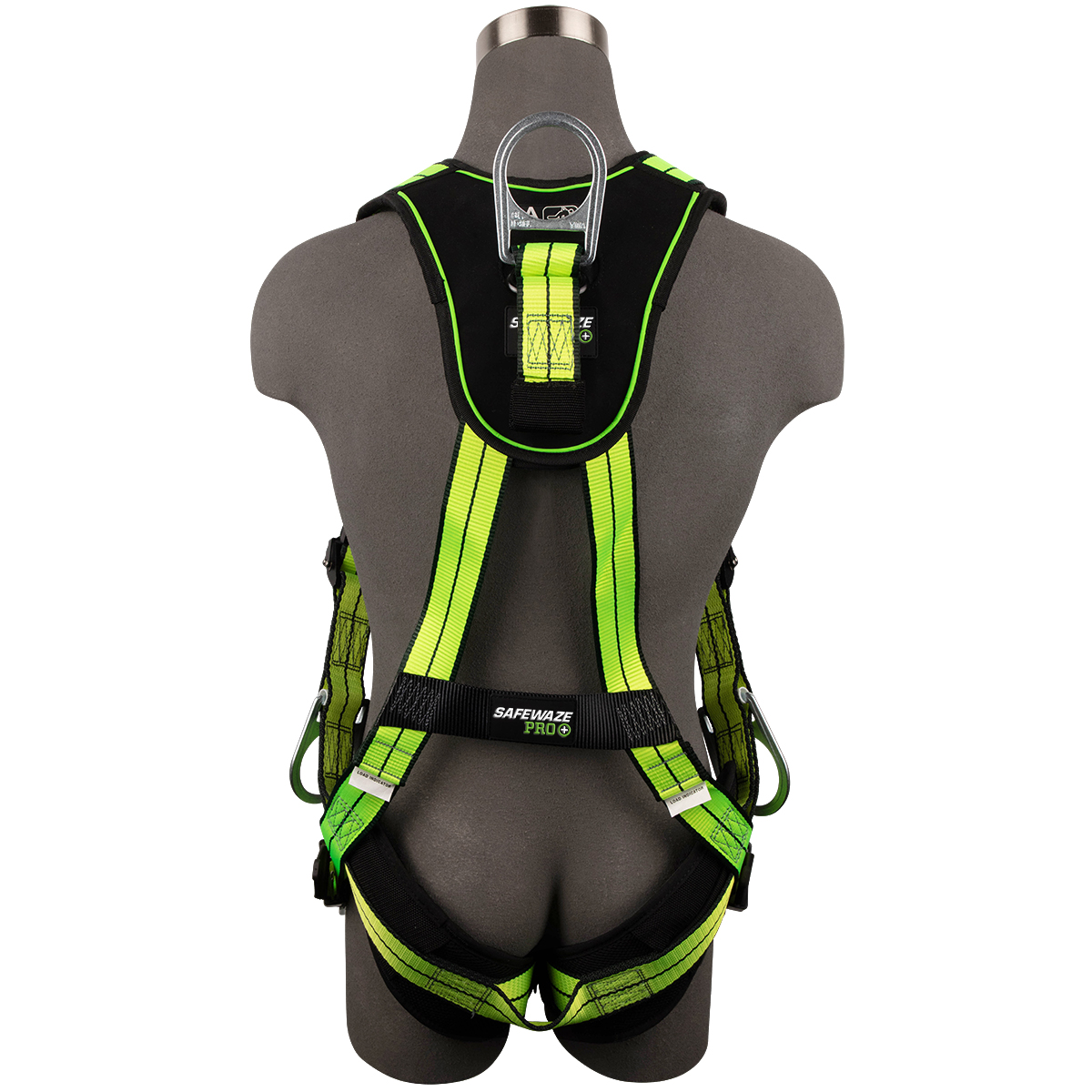The Safewaze PRO+ Harness is our all-steel premium harness, combining innovation with functionality. High-vis abrasion resistant green webbing and advanced technical padding, composed of moisture wicking linings and closed cell foam, provide all-day ease of use and extended product life. Models equipped with dorsal SRL link, corrosive resistant steel-plated D-rings, quick-connect buckles and aluminum torso adjusters.