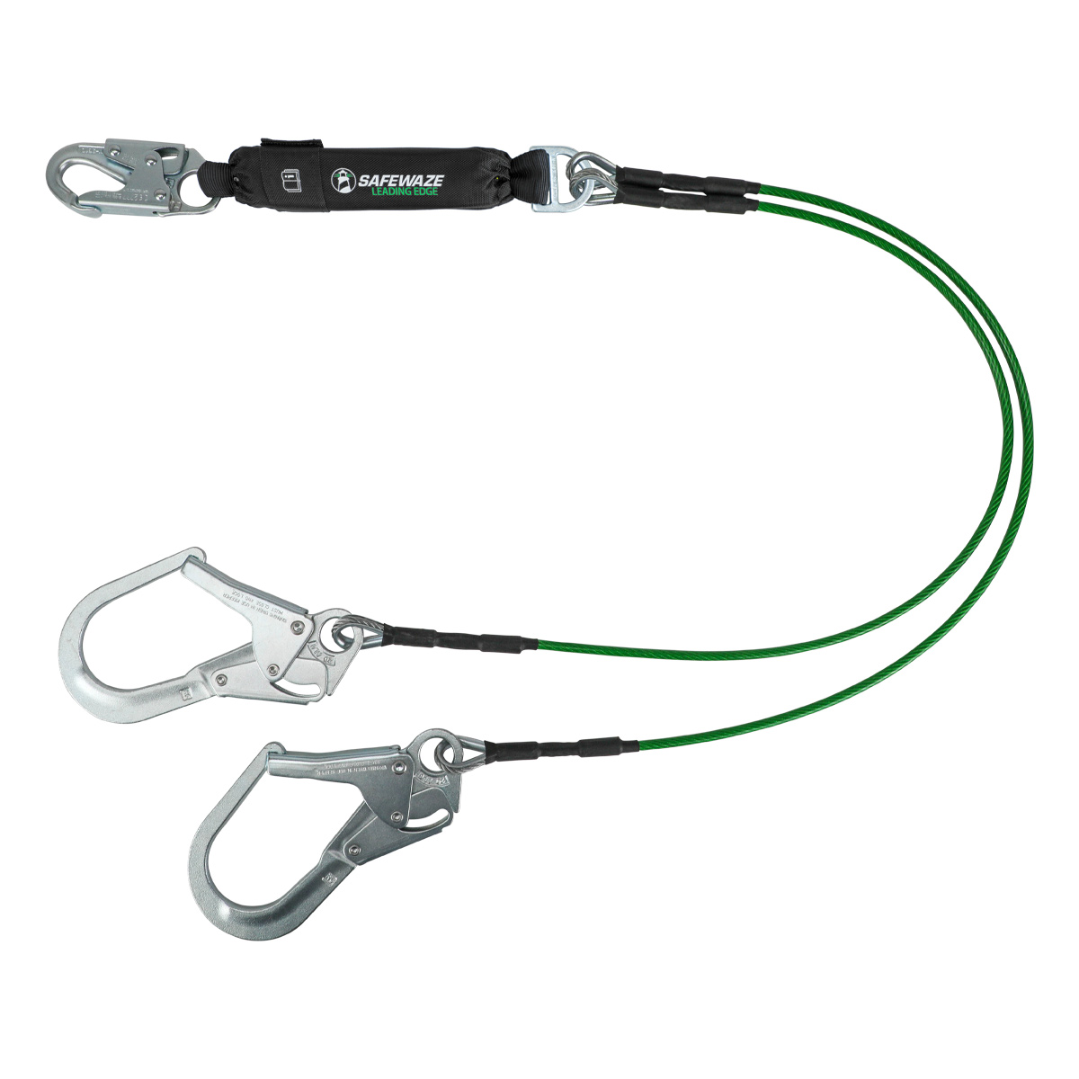 The Safewaze Leading Edge 6' Energy Absorbing Lanyard provides edge protection to users of any weight class, working at both 6' and 12' free fall heights. This versatile all-in-one solution is built with coated 1/4″ aircraft grade steel cable, specially engineered tear webbing to reduce fall arrest force and ballistic absorber cover.