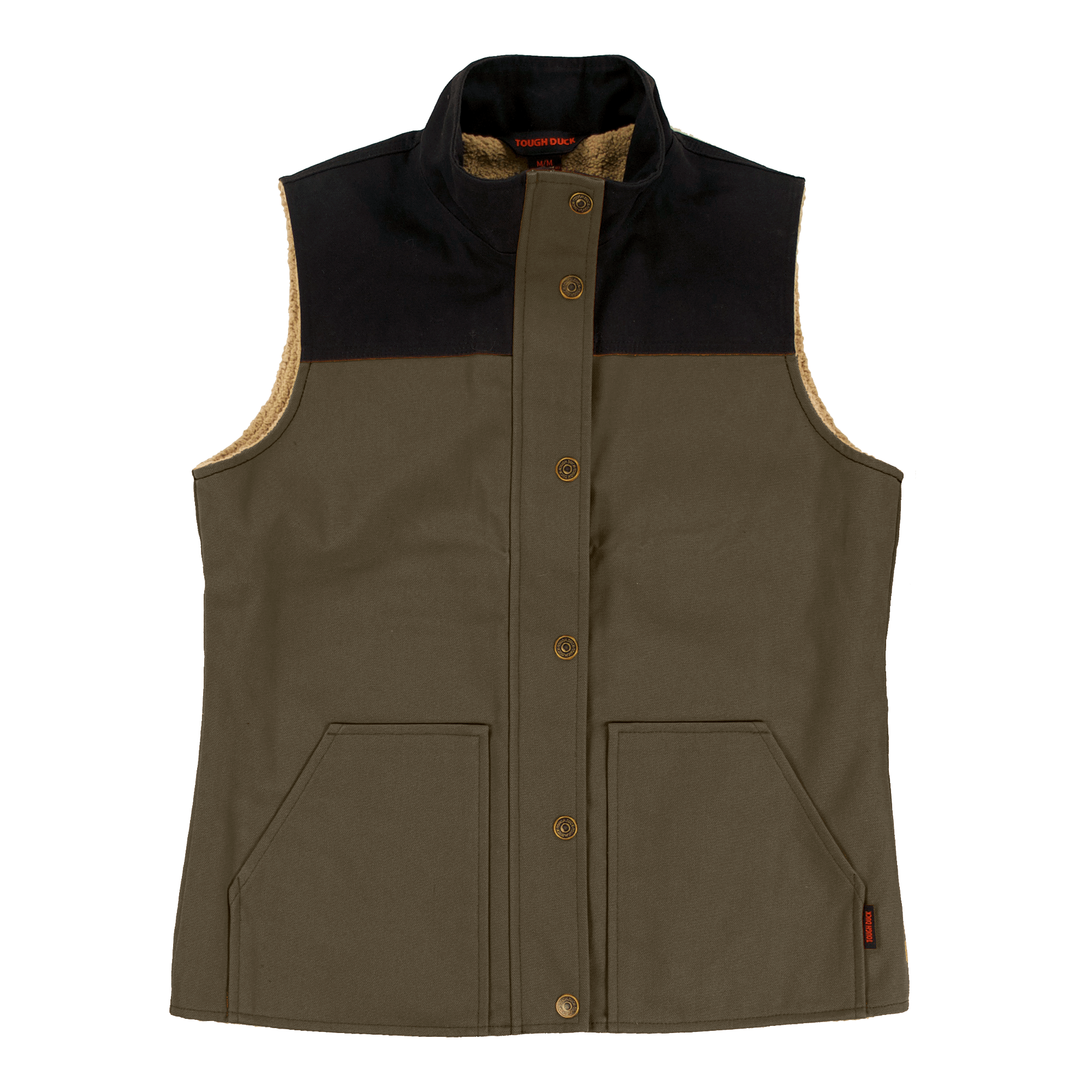 Tough DuckŪ WV09 Woman's Duck Sherpa Lined Vest, Brown with Black Contrast, Water and Wind Resistant