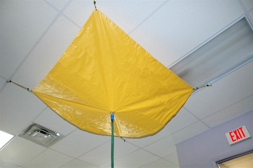 • Large vinyl-coated fabric catches roof leaks and diverts them using a standard hose hookup