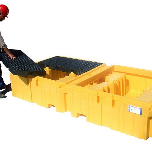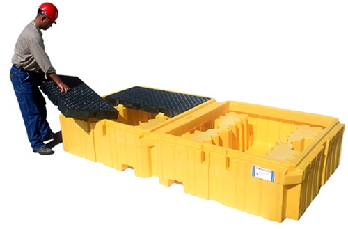 Using this UltraTech Twin IBC Spill Contamination Pallet helps you save money by storing two IBC tanks side by side.  For use with intermediate bulk containers, drums, or other large vessels.  All materials stored must be chemically compatible.  Grates are easily removed for cleaning.  One continuous sump holds 535 gallons - meets EPA Containment and SPCC Regulations for two IBC tanks.  Available with and without bucket shelves for either or both sides.  Helps to catch small leaks during dispensing.  Click "Larger Image" button to see additional images.  The spill pallet measures 124.5" x 61-5/8" x 22".  Bucket shelf dimensions are 19.5" x 16" x 14.5".