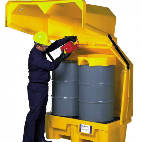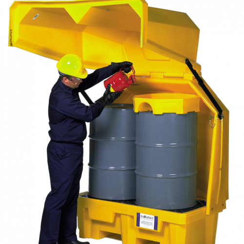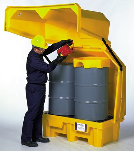 The 2 Drum Management is an outdoor secondary containment storage system to keep the elements out while providing convenient access to drums.  These all polyethylene units feature a lockable, weather-proof design.  This allows secure outdoors storage of hazardous materials and wastes.  Drums and collection sump remain clean and dry free of rain water, debris and other containment.  66 gallon containment capacity meets EPA and Uniform Fire Code Spill Containment Regulations.  Applications include storage of virgin chemicals, drum dispensing, hazardous waste collection and storage of spill response materials.  Dimensions - 57" x 30.5" x 63.5", containment capacity:  66 gallons, Uniformly Distributed Load:  3000 lbs.  Click "Larger Images" for image of item open and closed.  Available with or without drain.
