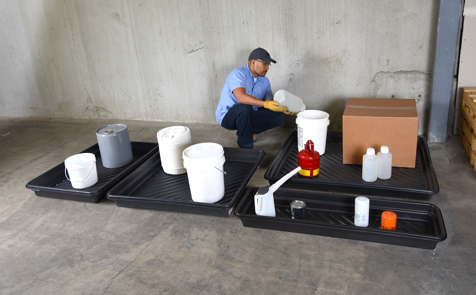 • Ribbed bottom to keep cans and pails elevated and out of small spills or leaks