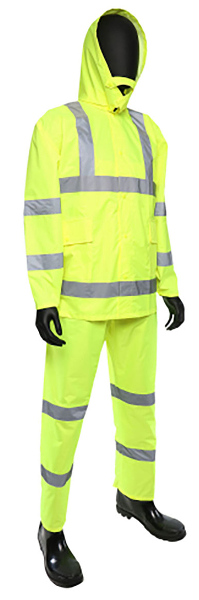 This ANSI CLASS III Certified 3 piece High-Visibility Rainsuit is made from PolyOxford material specially treated with a polyurethane coating, providing maximum visibility.